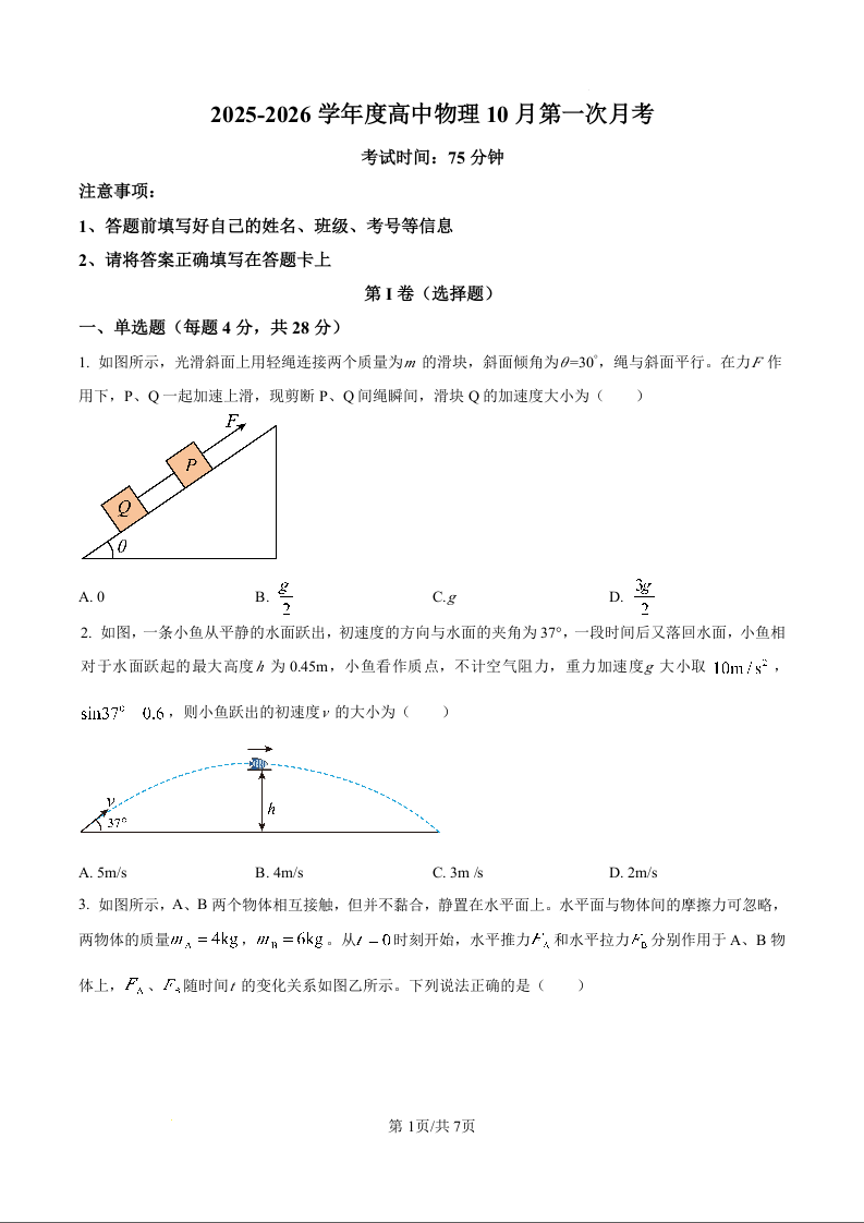 高三物理(原卷版)--河北省石家庄市第三十八中学2026届高三上学期10月月考