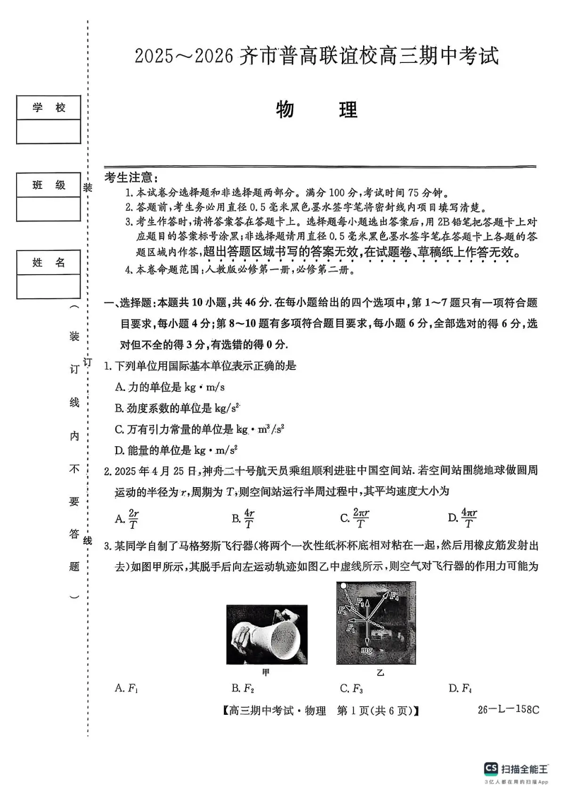 高三物理--黑龙江省齐齐哈尔市普通高中联谊学校2026届高三上学期期中考试