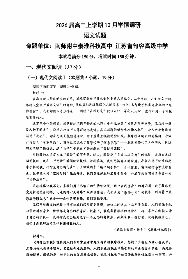 高三语文--江苏省南京市、镇江市、徐州市联盟校2026届高三上学期10月学情调研