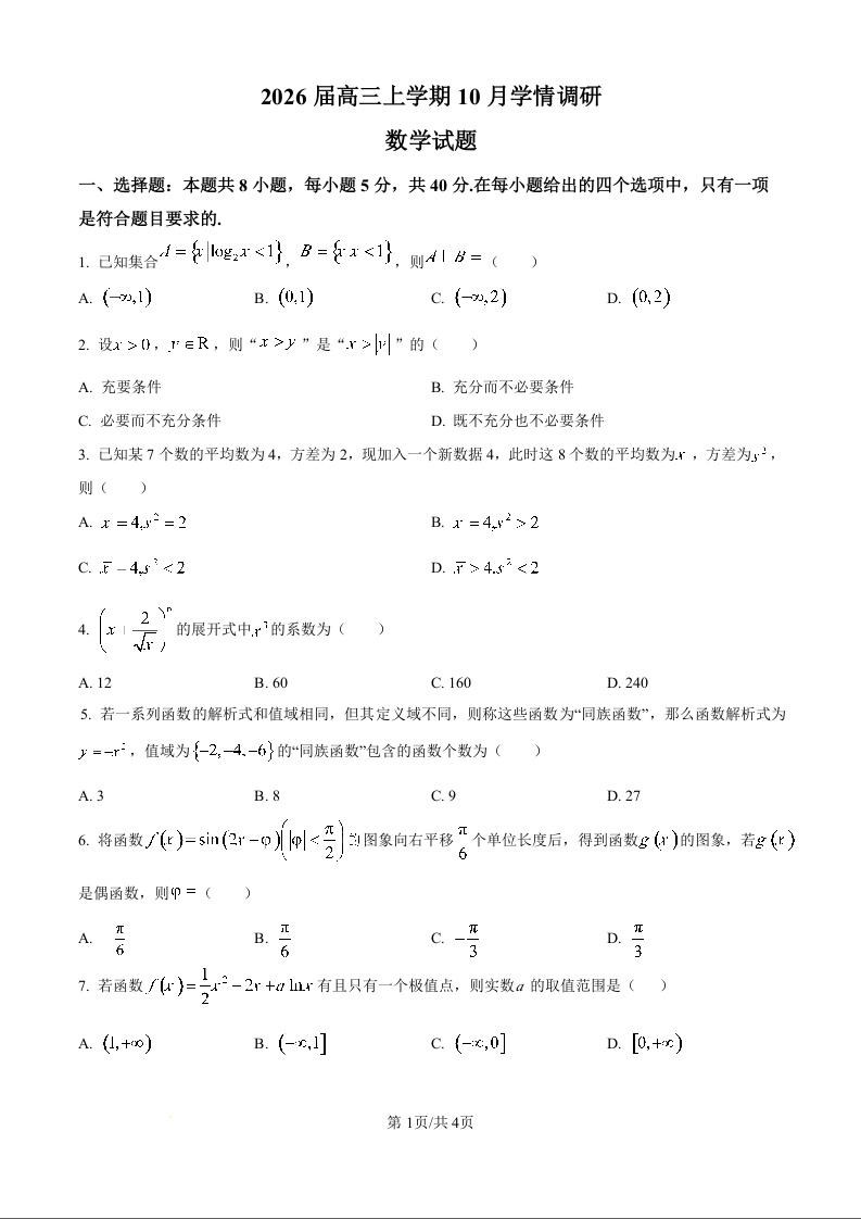 高三数学(原卷版)--江苏省南京市、镇江市、徐州市联盟校2026届高三上学期10月学情调研