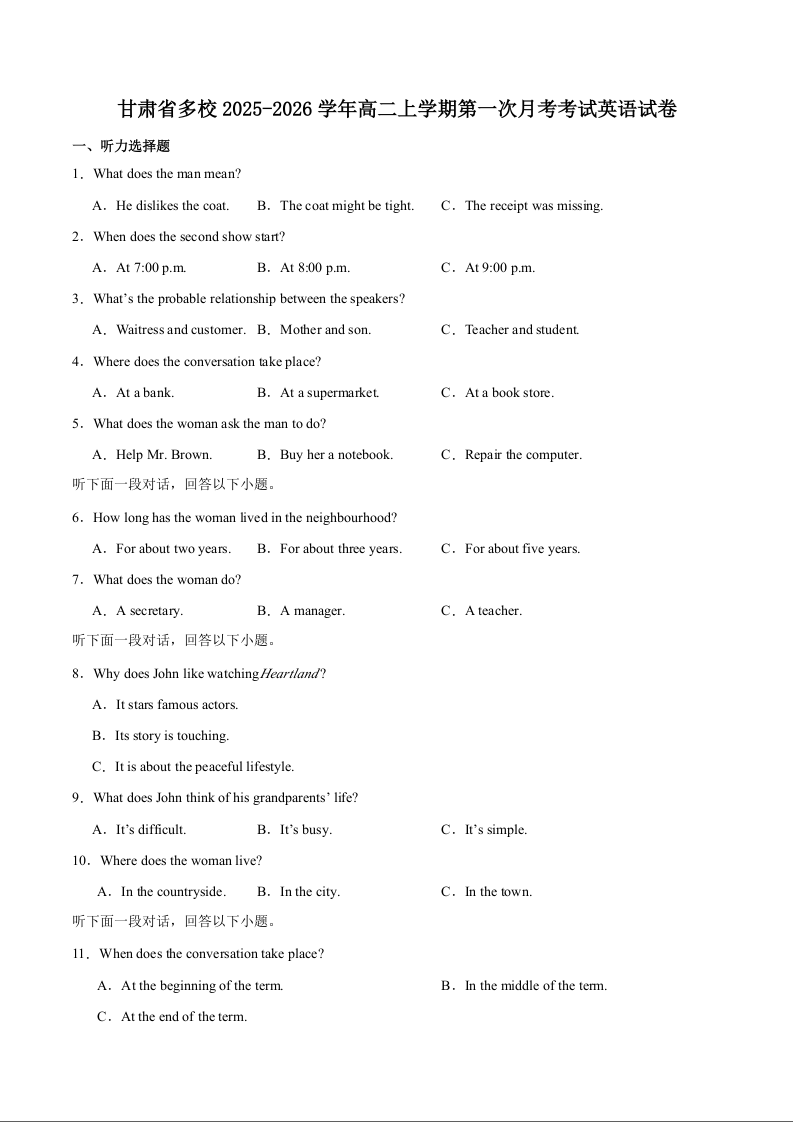 高二英语+答案--甘肃省多校2025-2026学年高二上学期第一次月考试题
