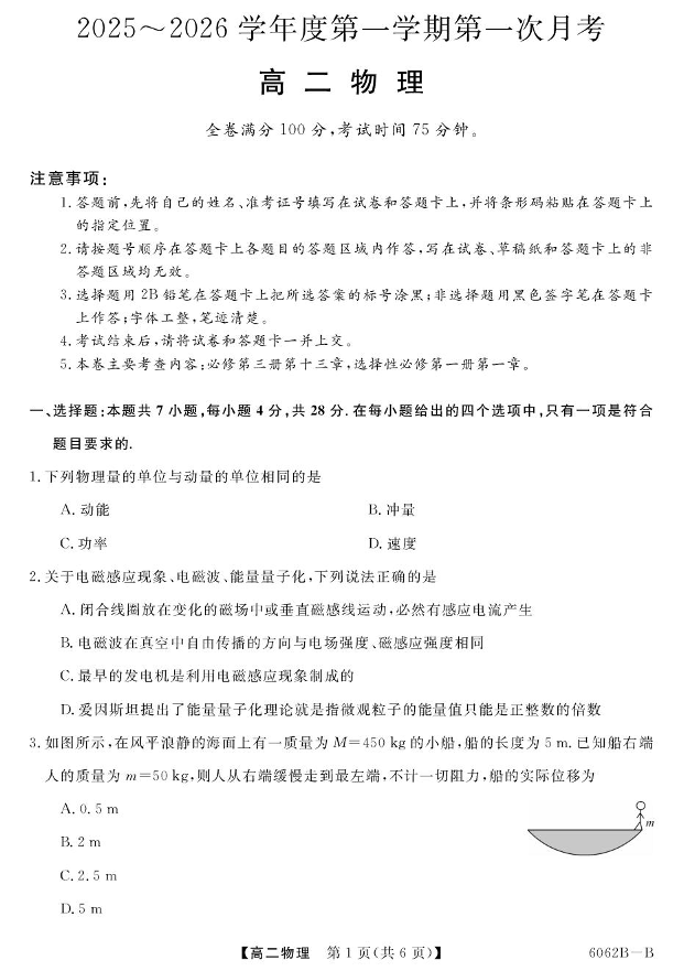 高二物理+答案--甘肃省多校2025-2026学年高二上学期第一次月考试题