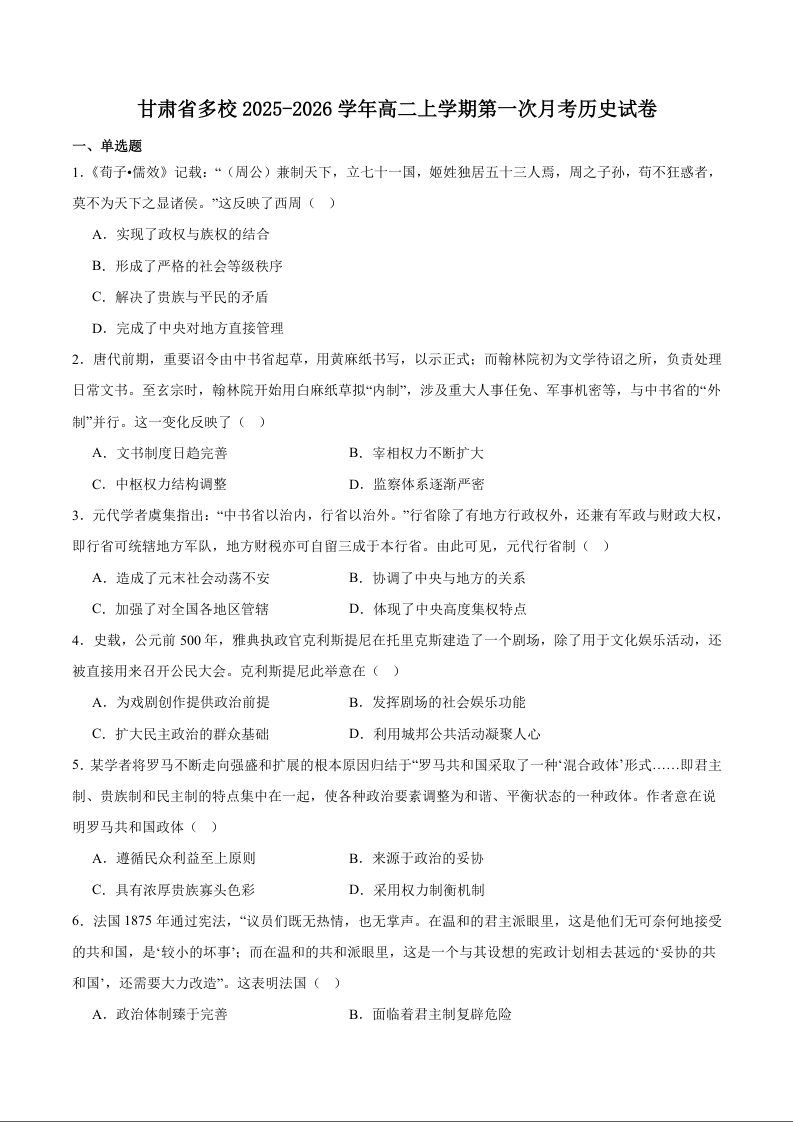 高二历史+答案--甘肃省多校2025-2026学年高二上学期第一次月考试题