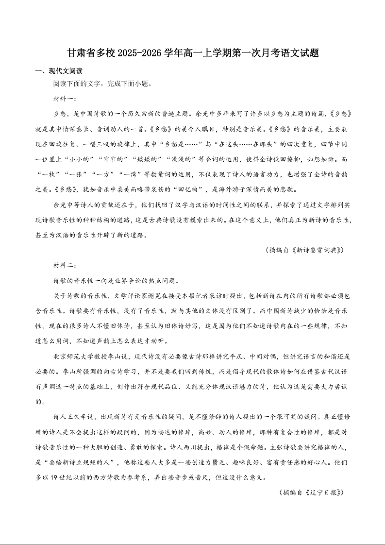 高一语文+答案--甘肃省多校2025-2026学年高一上学期第一次月考试题