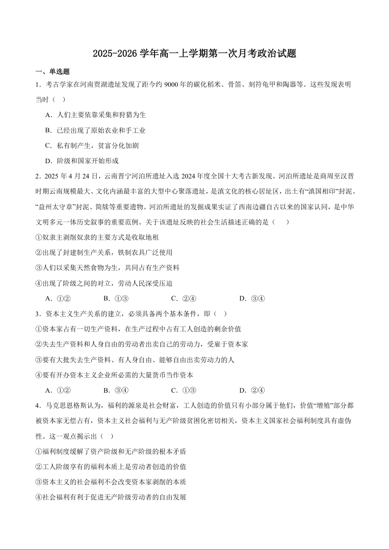 高一政治+答案--甘肃省多校2025-2026学年高一上学期第一次月考试题
