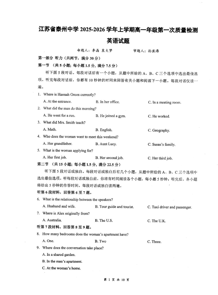 高一英语+答案--江苏省泰州中学2025-2026学年高一上学期第一次质量检测