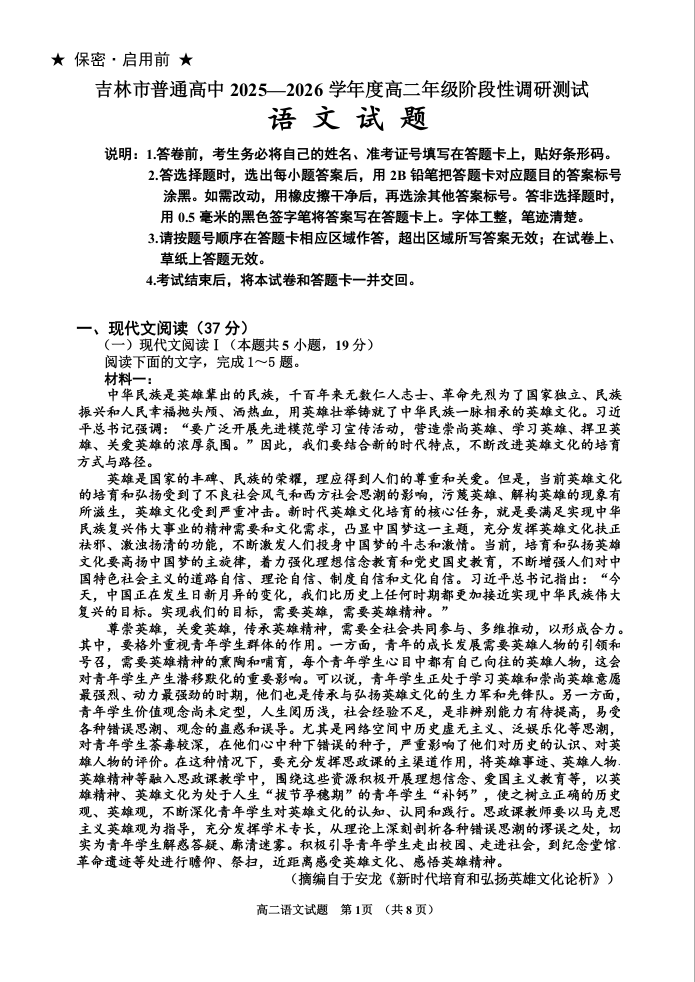 高二语文--吉林省吉林市普通高中2025-2026学年高二上学期期中考试