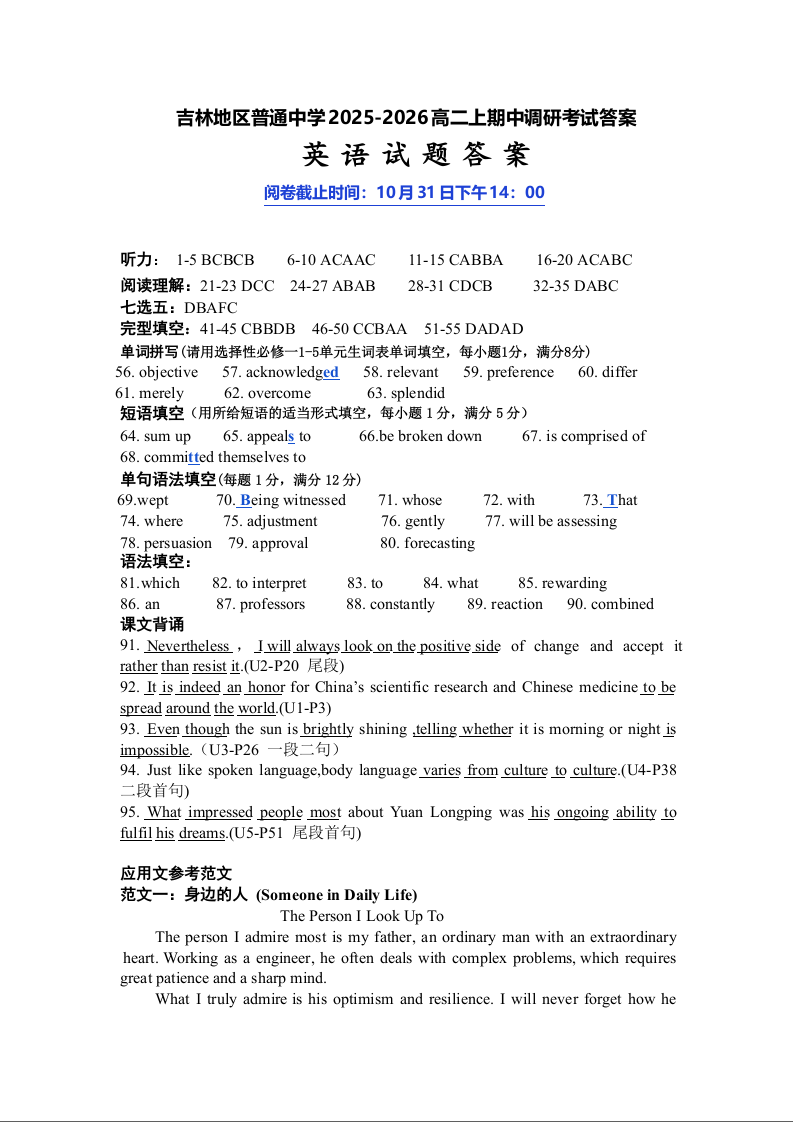 高二英语答案--吉林省吉林市普通高中2025-2026学年高二上学期期中考试
