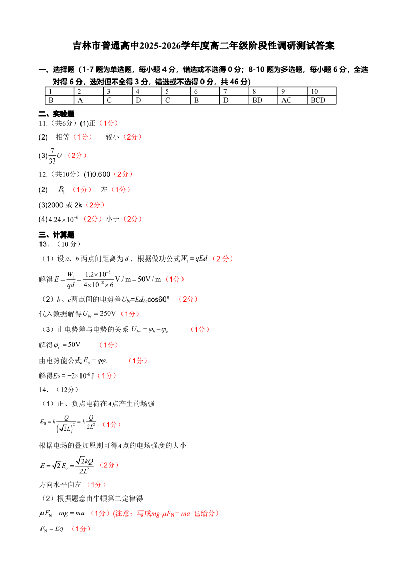 高二物理答案--吉林省吉林市普通高中2025-2026学年高二上学期期中考试