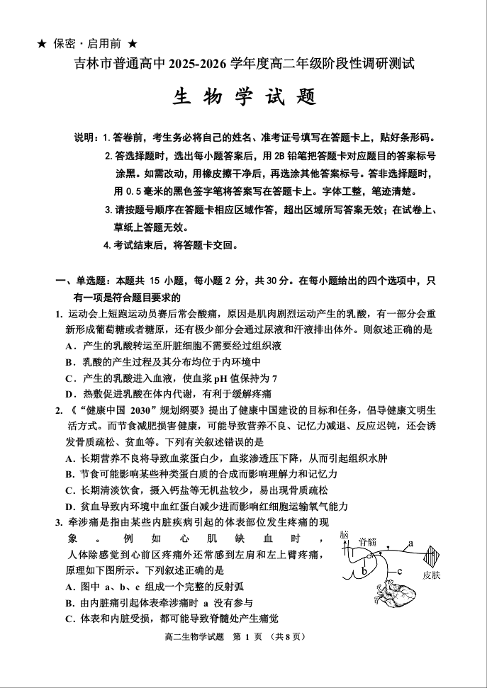 高二生物--吉林省吉林市普通高中2025-2026学年高二上学期期中考试