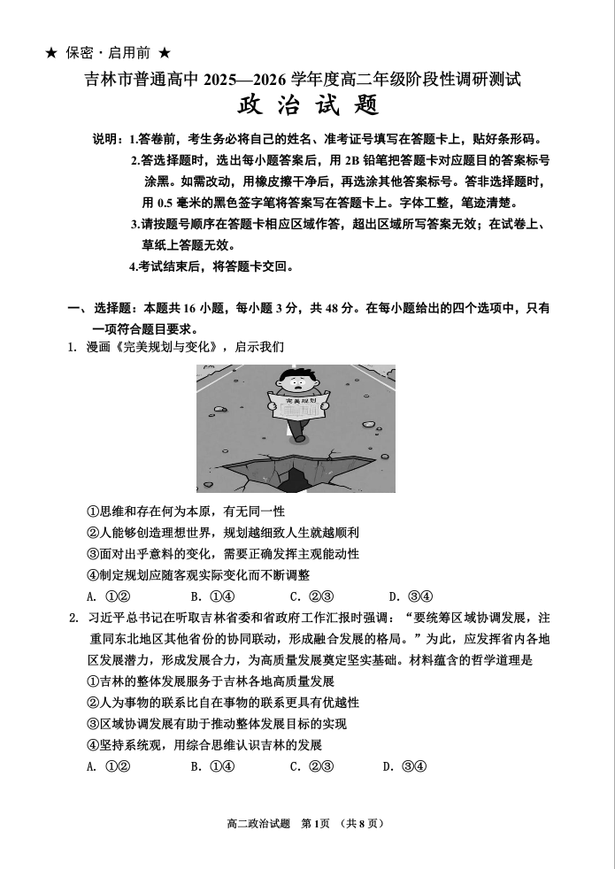 高二政治--吉林省吉林市普通高中2025-2026学年高二上学期期中考试