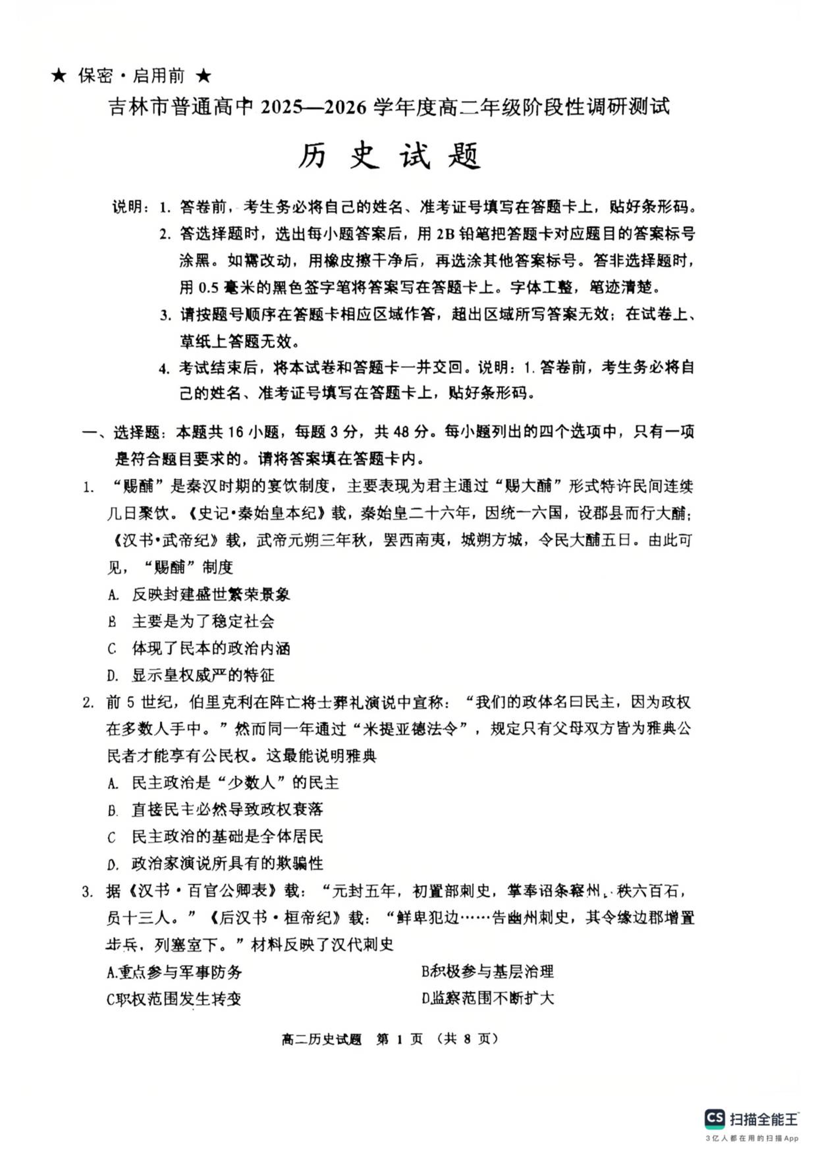 高二历史--吉林省吉林市普通高中2025-2026学年高二上学期期中考试