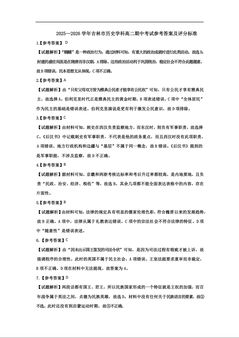 高二历史答案--吉林省吉林市普通高中2025-2026学年高二上学期期中考试