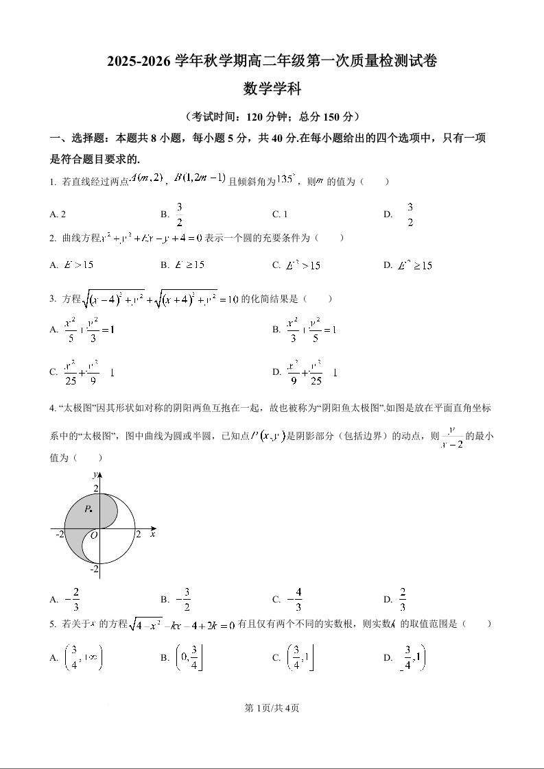 高二数学(原卷版)--江苏省泰州中学2025-2026学年高二上学期第一次质量检测