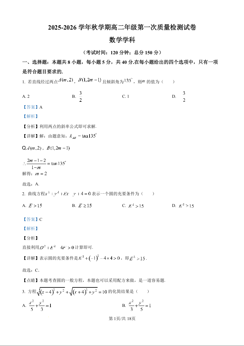 高二数学(精品解析版)--江苏省泰州中学2025-2026学年高二上学期第一次质量检测