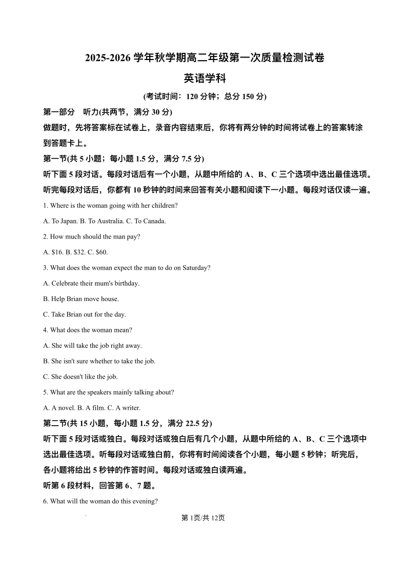 高二英语+答案--江苏省泰州中学2025-2026学年高二上学期第一次质量检测