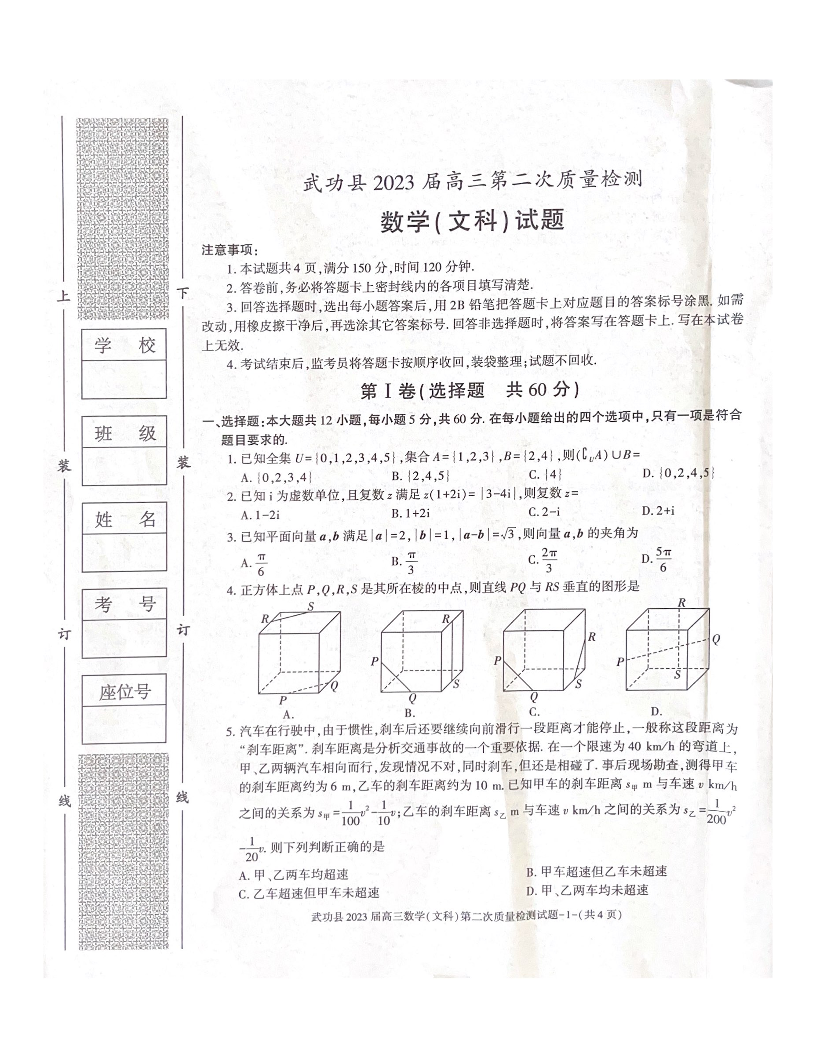 高三文数--陕西省咸阳市武功县2022-2023学年高三上学期第二次质量检测