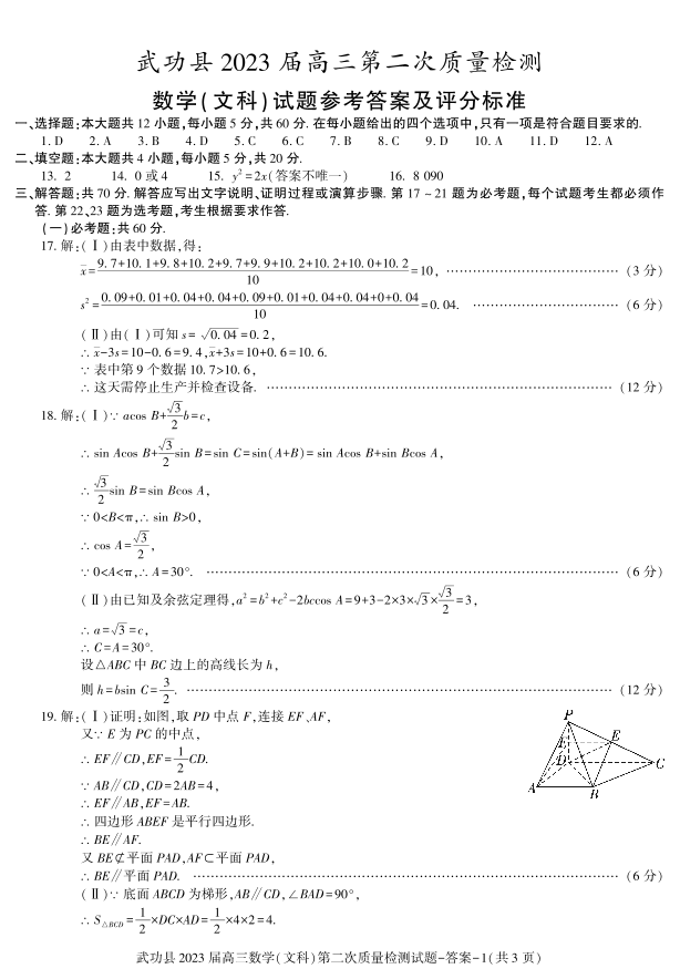 高三文数答案--陕西省咸阳市武功县2022-2023学年高三上学期第二次质量检测