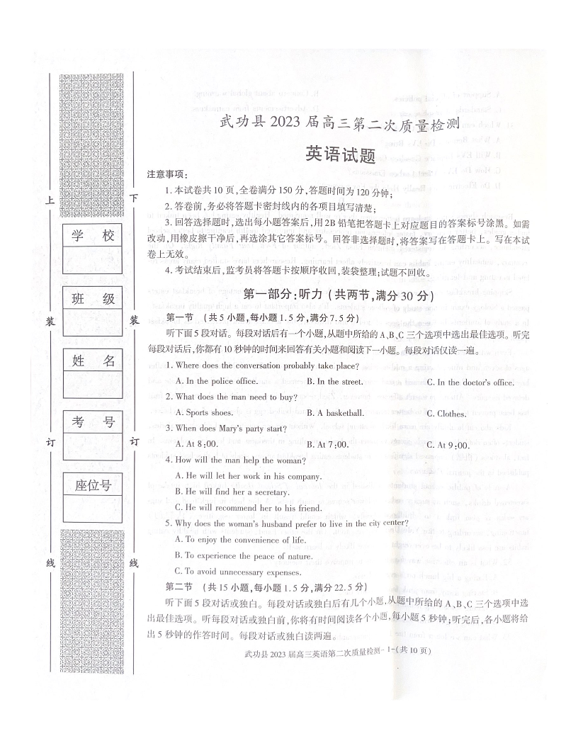 高三英语--陕西省咸阳市武功县2022-2023学年高三上学期第二次质量检测