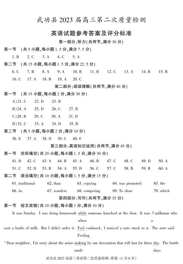 高三英语答案--陕西省咸阳市武功县2022-2023学年高三上学期第二次质量检测