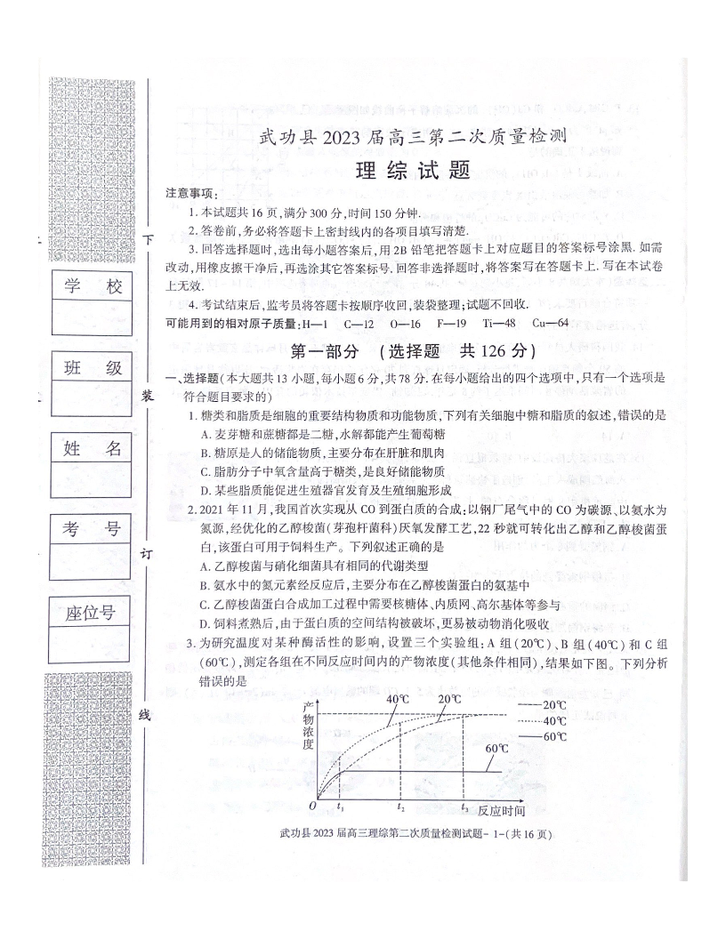 高三理综--陕西省咸阳市武功县2022-2023学年高三上学期第二次质量检测