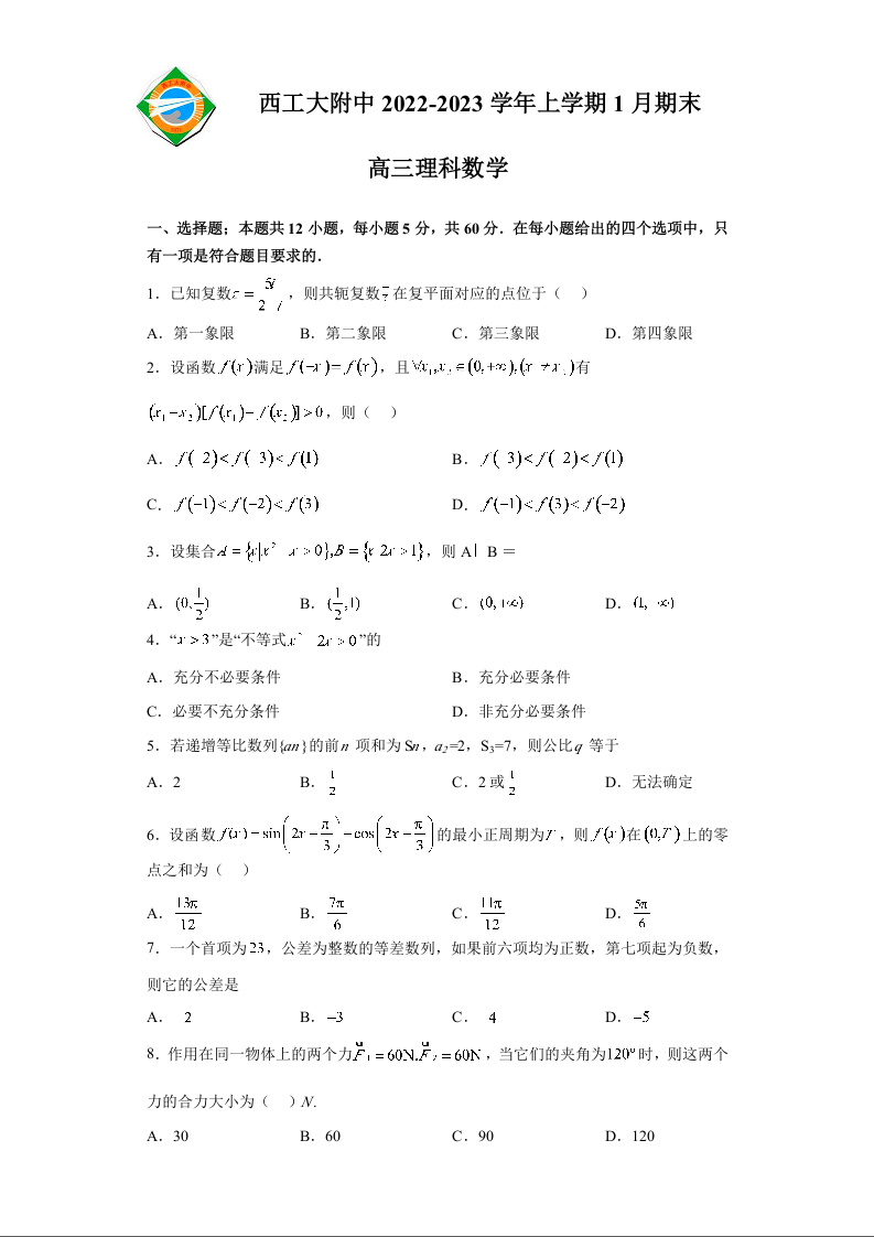 高三理科数学+答案--陕西省西安市西北工业大学附属中学高三上学期1月期末考试