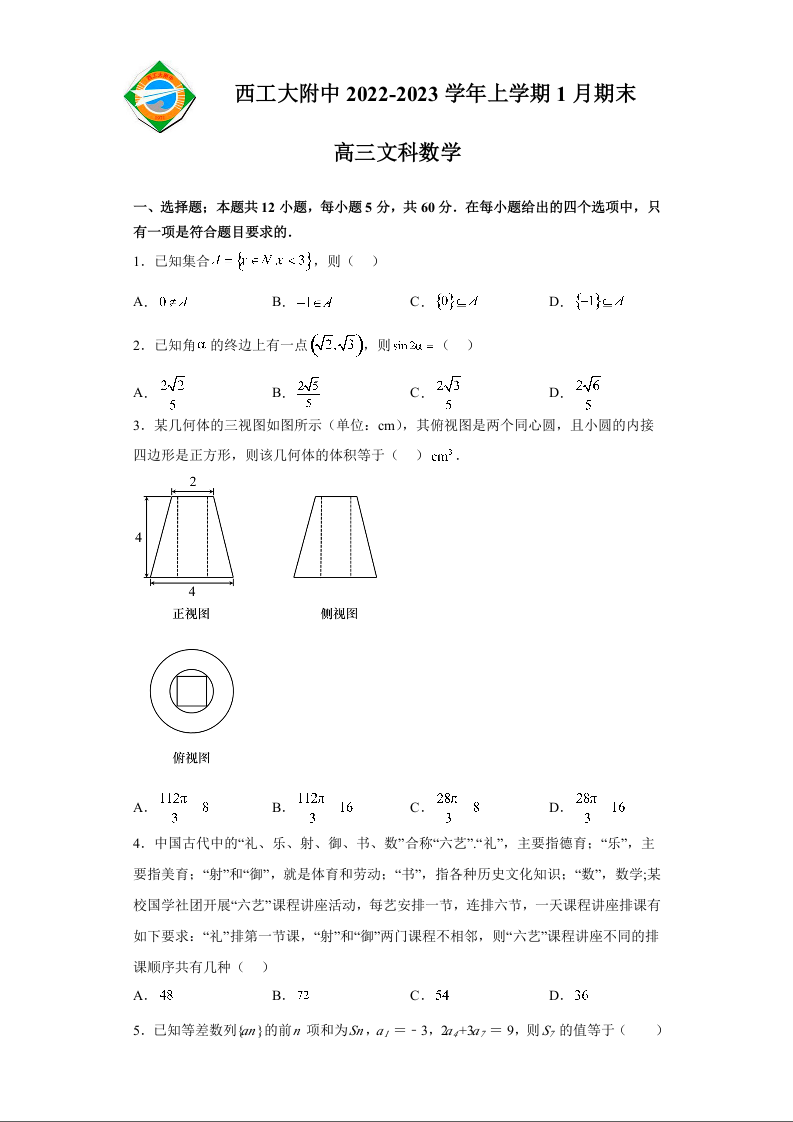 高三文科数学+答案--陕西省西安市西北工业大学附属中学高三上学期1月期末考试