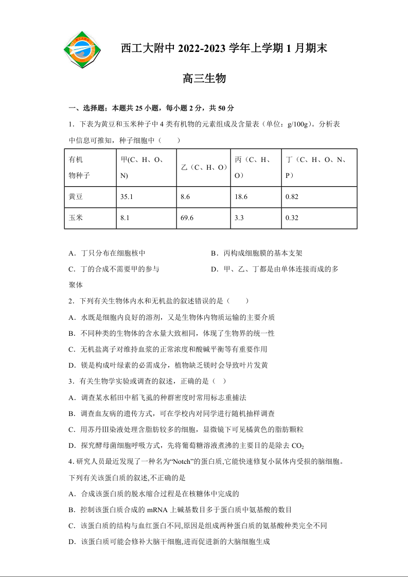 高三生物+答案--陕西省西安市西北工业大学附属中学高三上学期1月期末考试