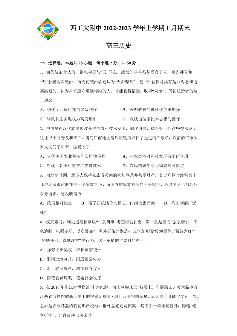 高三历史+答案--陕西省西安市西北工业大学附属中学高三上学期1月期末考试