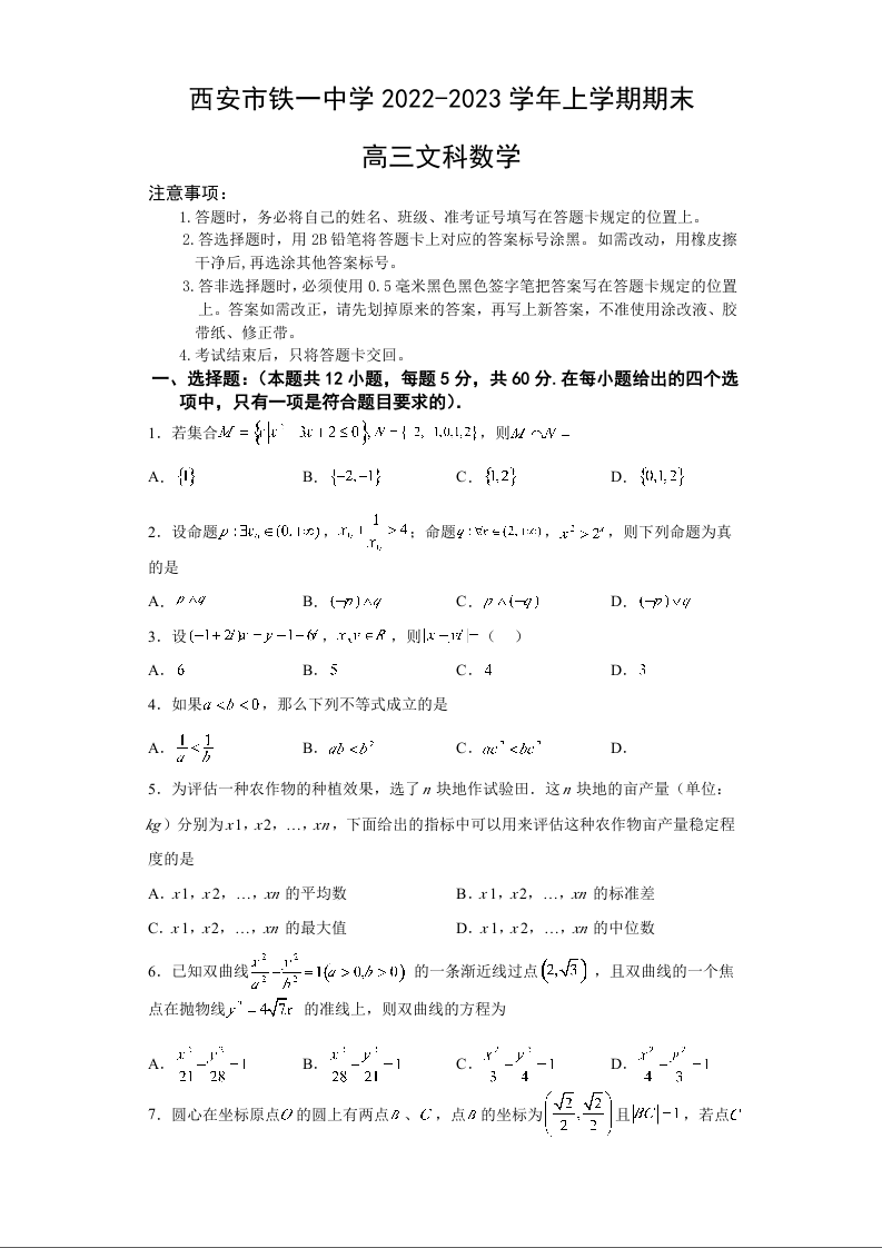 高三文科数学+答案--陕西省西安市铁一中学2022-2023学年高三上学期期末考试