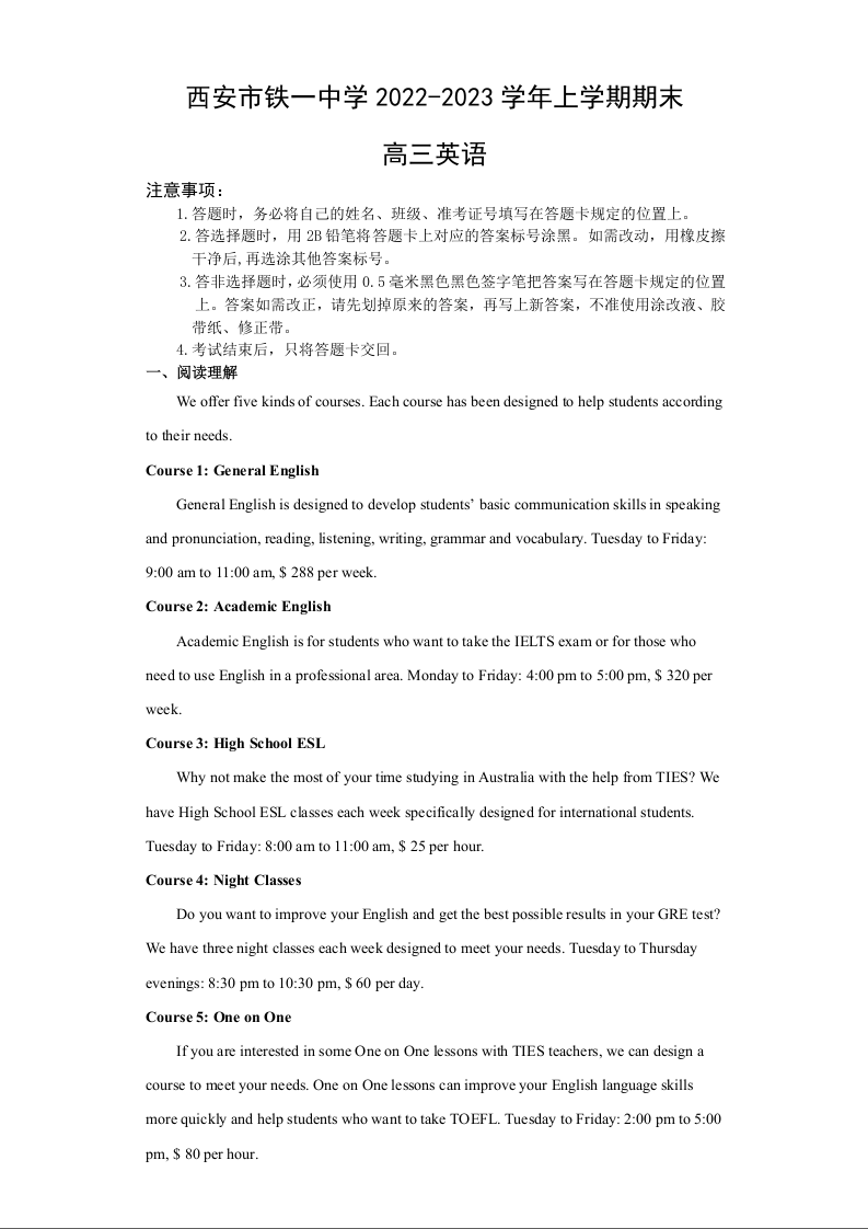 高三英语+答案--陕西省西安市铁一中学2022-2023学年高三上学期期末考试