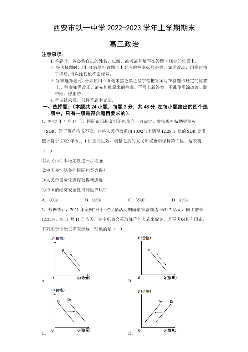 高三政治+答案--陕西省西安市铁一中学2022-2023学年高三上学期期末考试