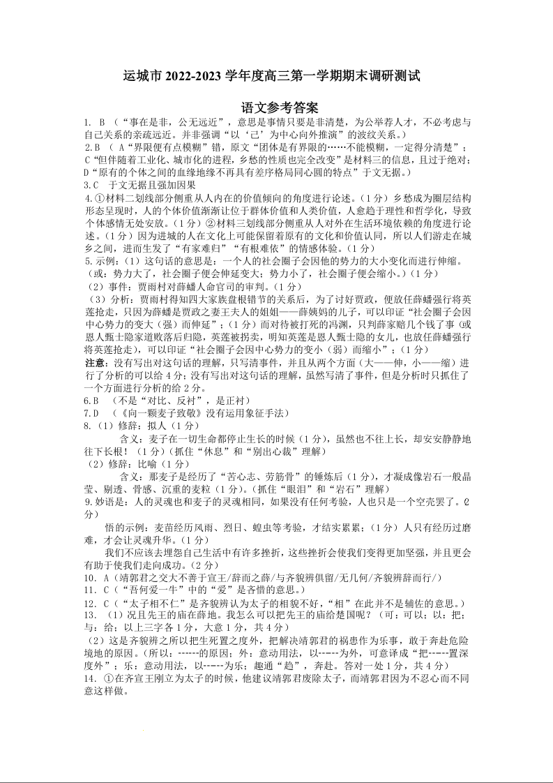 高三语文答案--山西省运城市2022-2023学年高三上学期期末调研测试