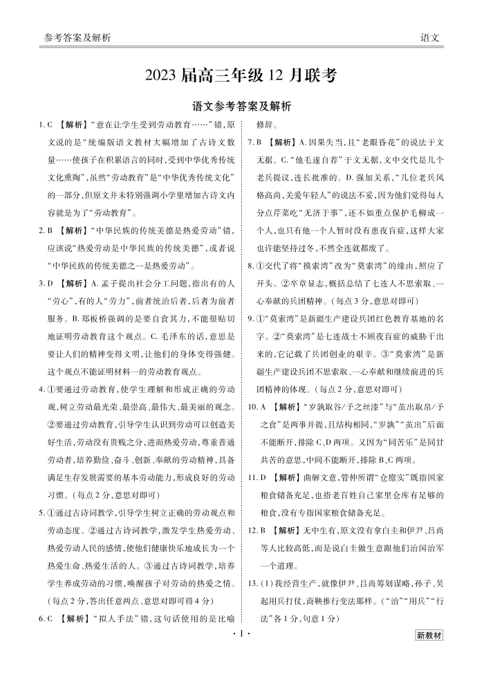 高三语文答案--山西省衡水金卷2023高三12月联考