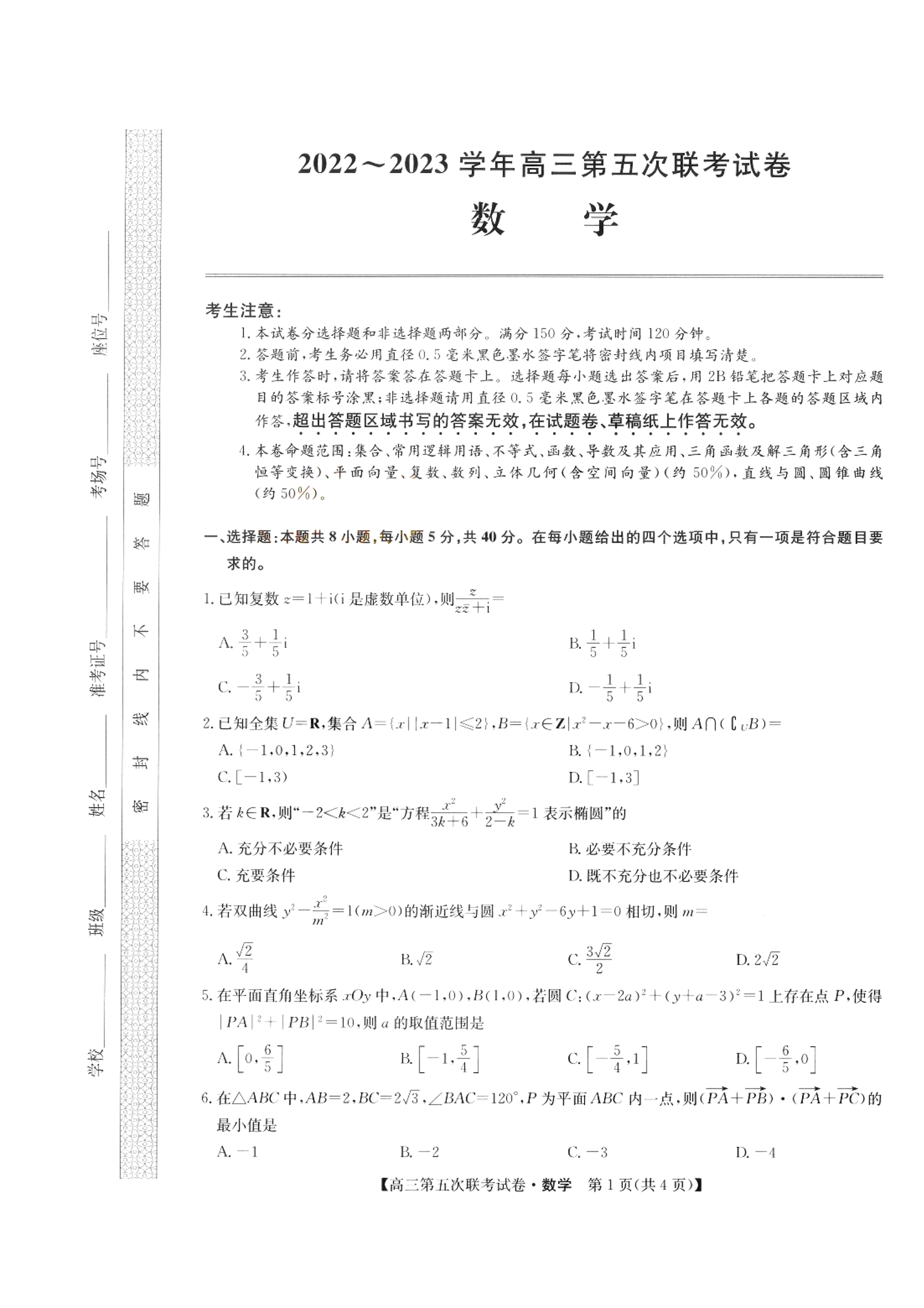 高三数学--山西省部分学校2022-2023学年高三上学期第五次联考