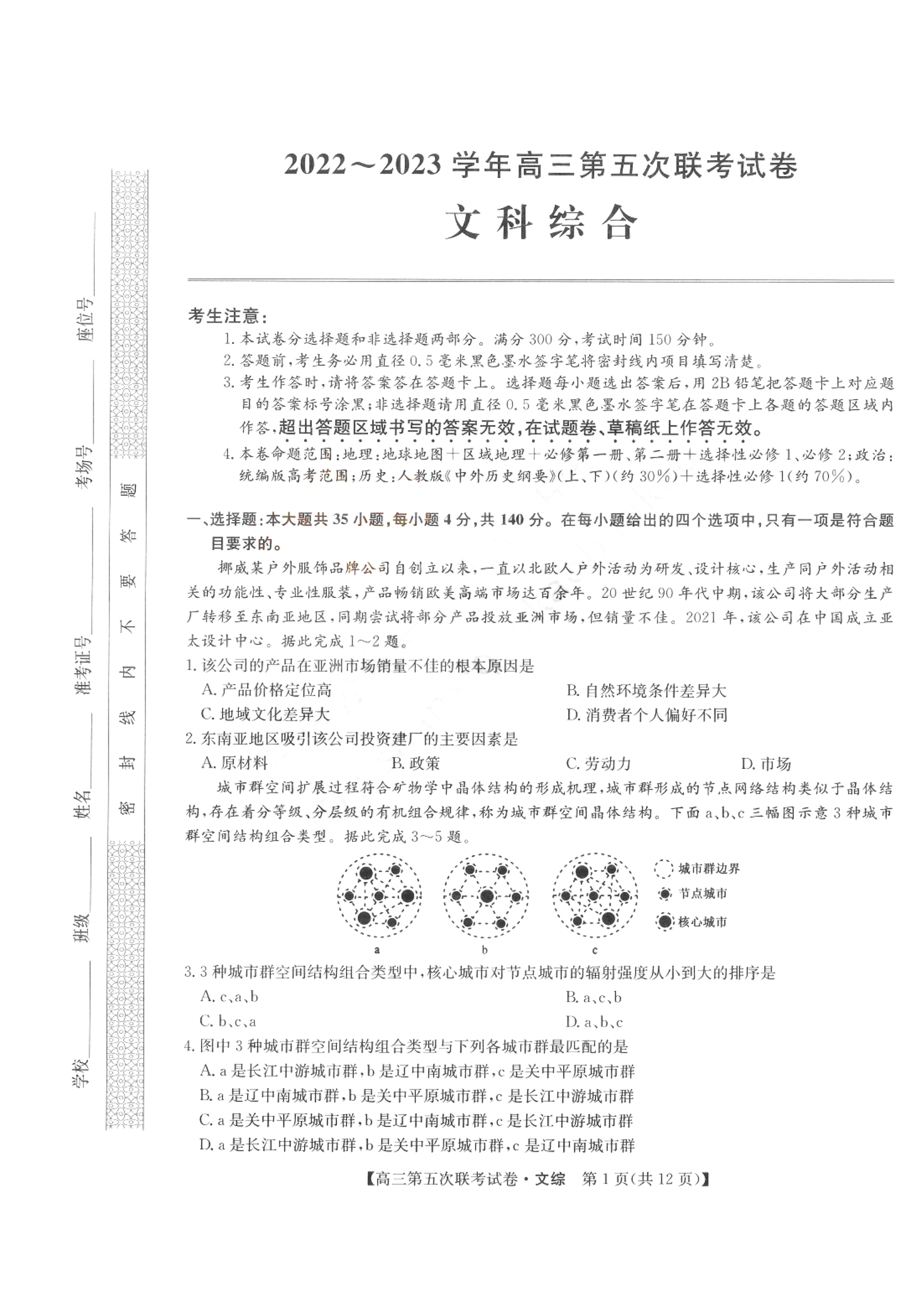 高三文科综合--山西省部分学校2022-2023学年高三上学期第五次联考