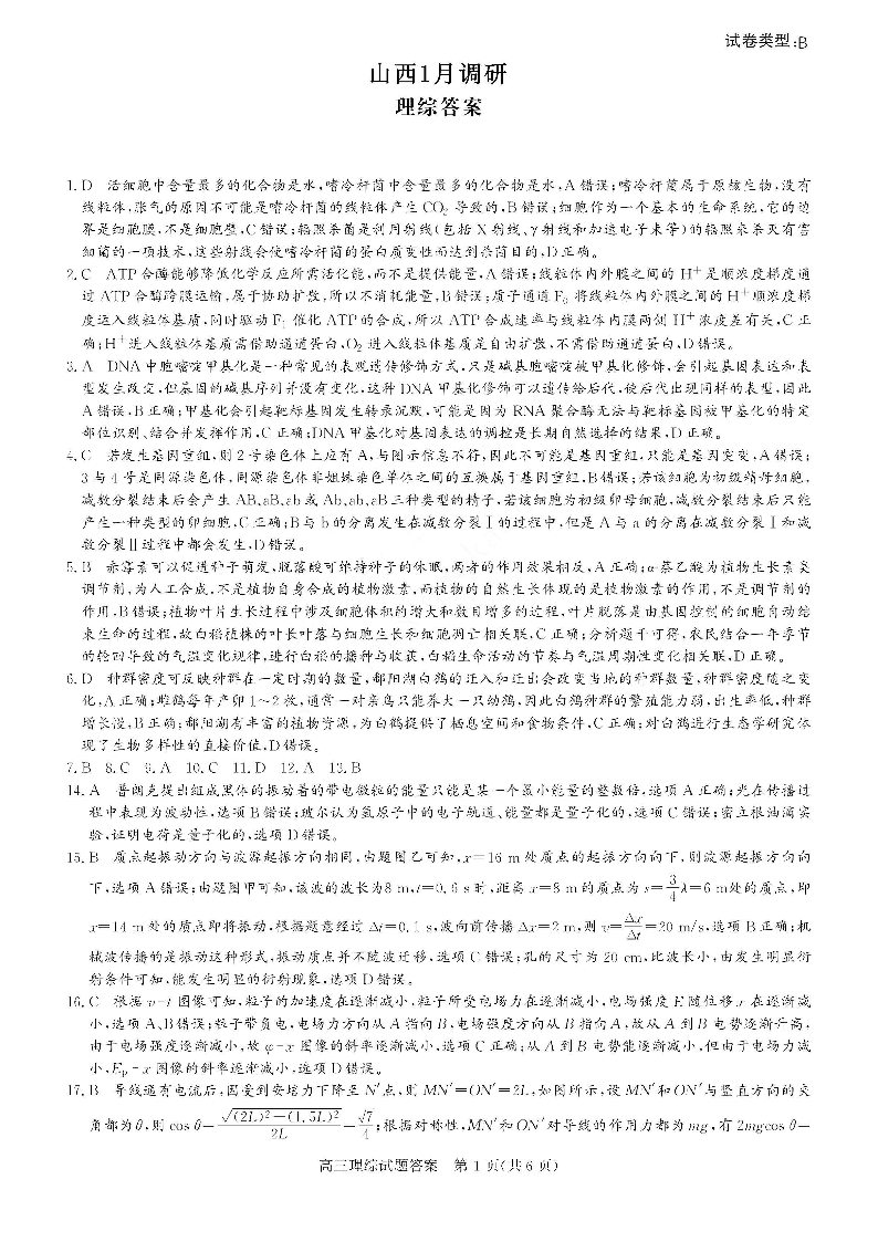 高三理综答案B卷--山西省2023年1月高三年级适应性调研测试