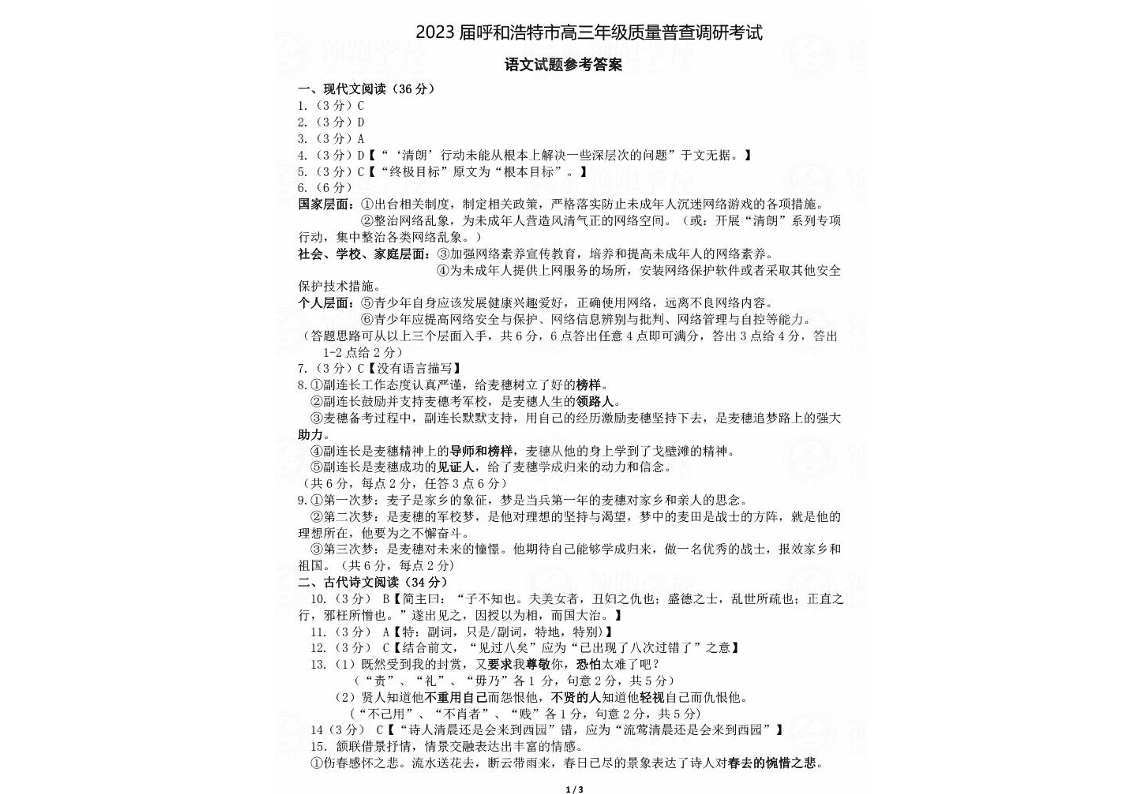 高三语文答案--内蒙古自治区呼和浩特市高三上学期质量普查调研考试(一模)