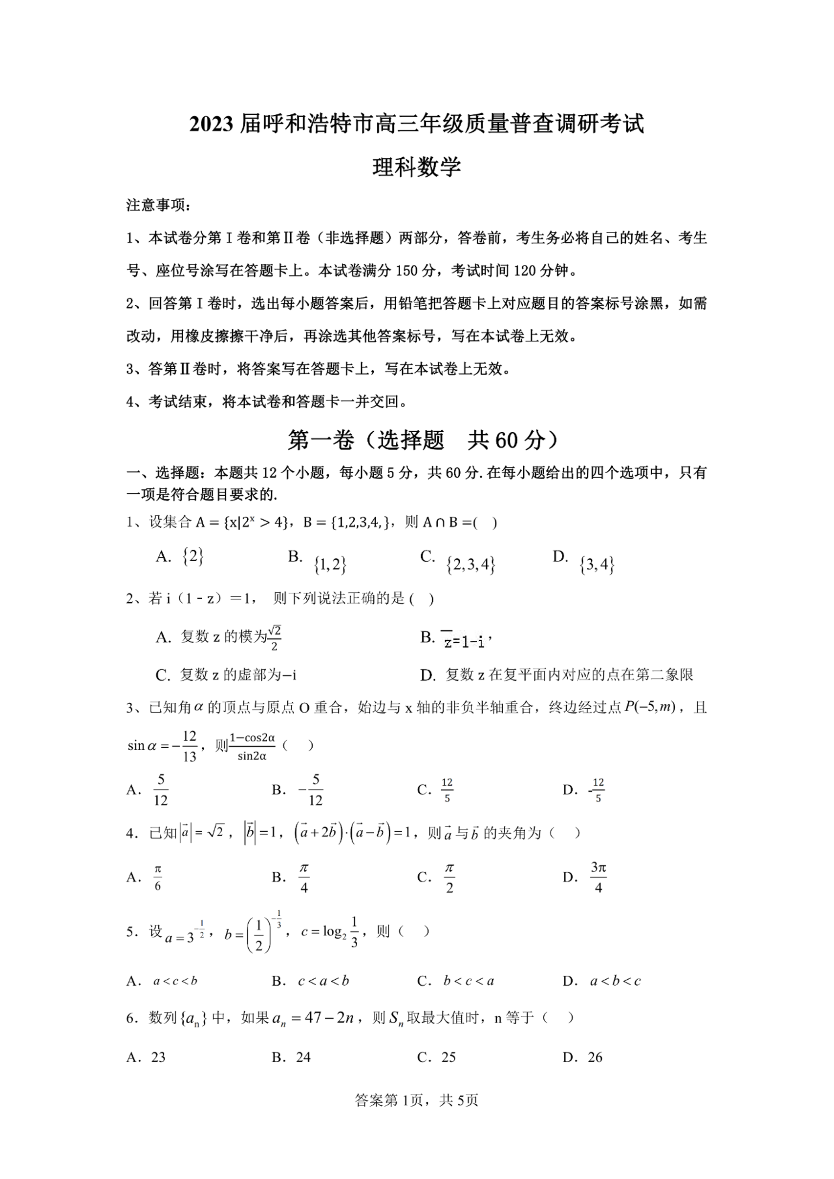 高三数学--内蒙古自治区呼和浩特市高三上学期质量普查调研考试(一模)