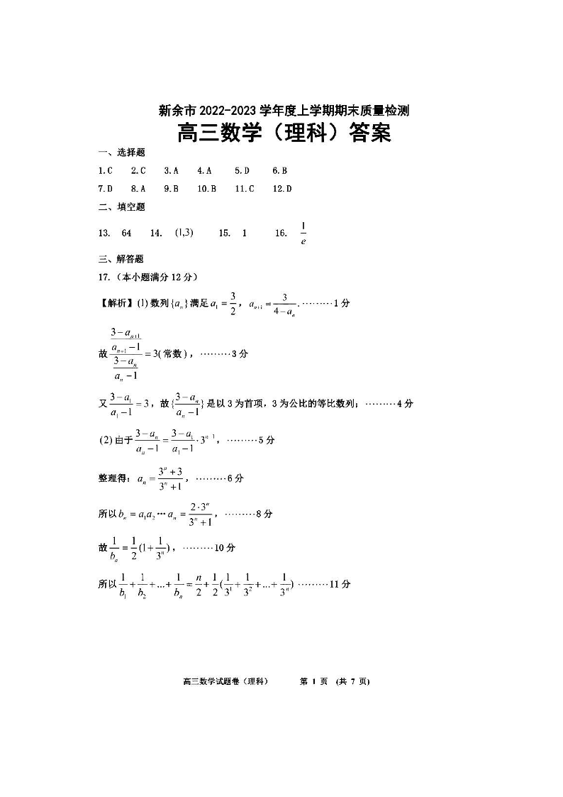 高三理数答案--江西省新余市2022-2023学年度上学期期末质量检测(一模)
