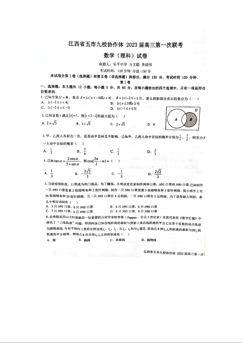 高三数学(理科)--江西省五市九校2023届高三1月联考