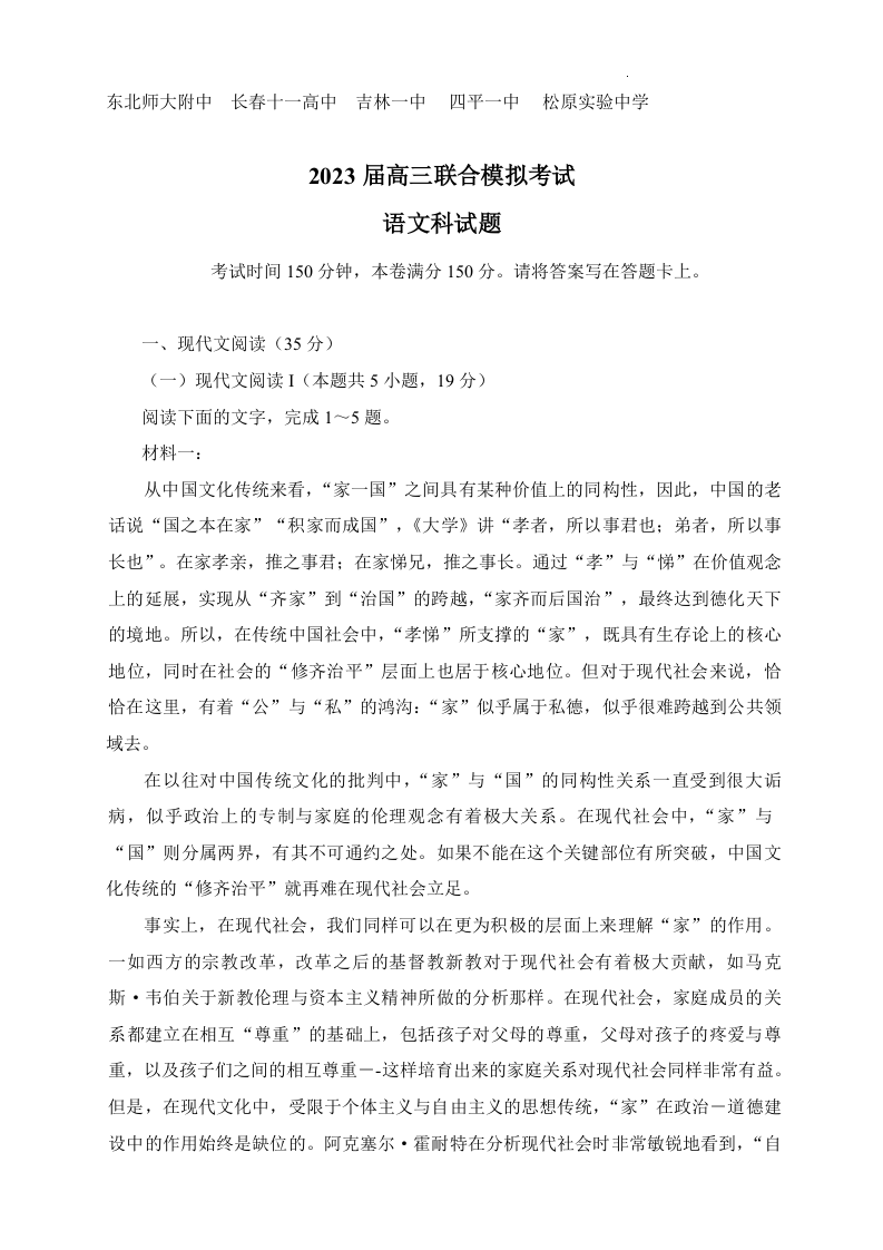 高三语文--吉林省五校2023届高三上学期联合模拟考试