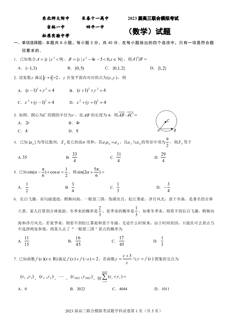 高三数学--吉林省五校2023届高三上学期联合模拟考试