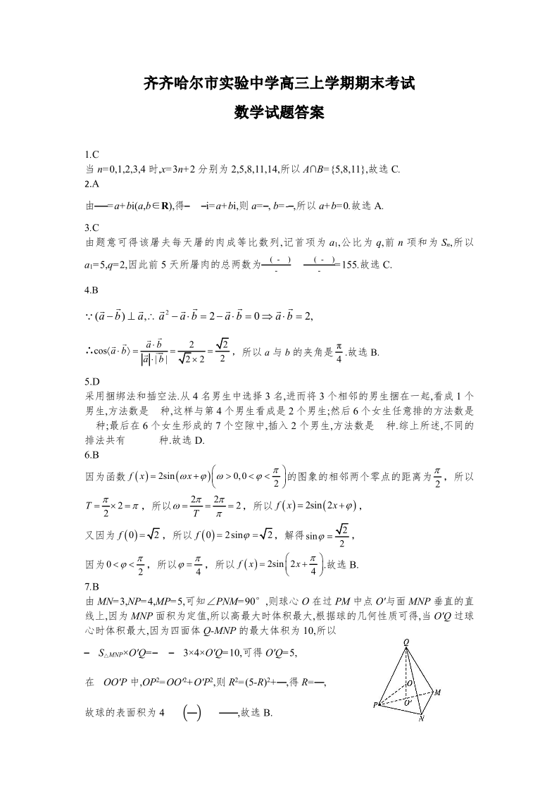 高三数学答案--黑龙江省齐齐哈尔市2023高三上学期期末考试