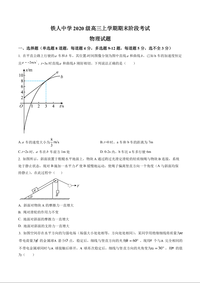 高三物理+答案--黑龙江省大庆铁人中学2022-2023学年高三上学期期末阶段考试