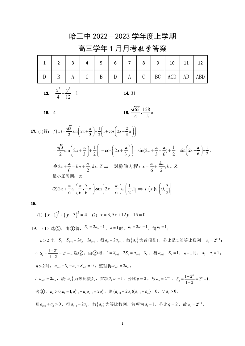 高三数学答案--黑龙江省哈尔滨市第三中学2022-2023学年高三1月月考