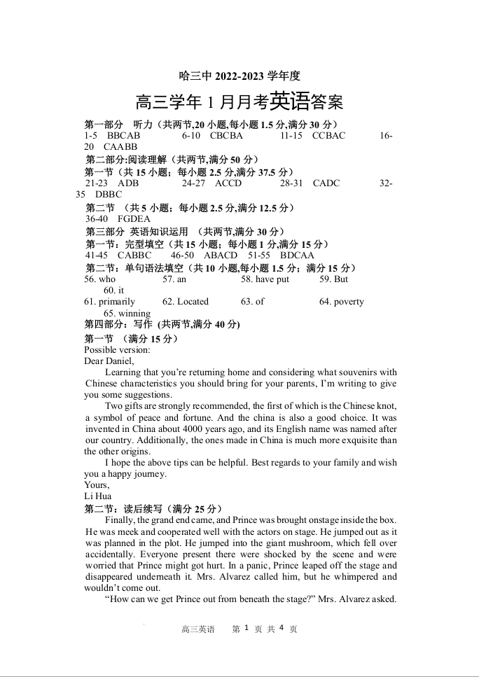 高三英语答案--黑龙江省哈尔滨市第三中学2022-2023学年高三1月月考