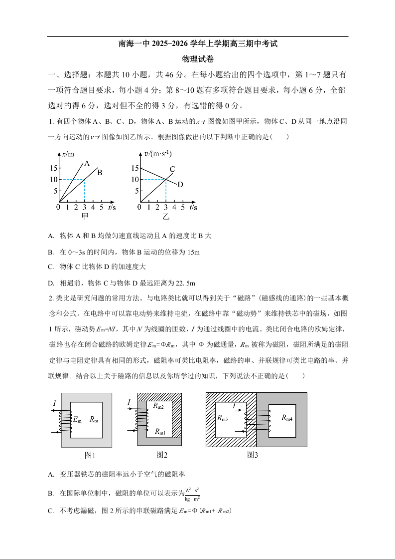 高三物理--广州市南海中学2025-2026学年高三上学期10月期中考试