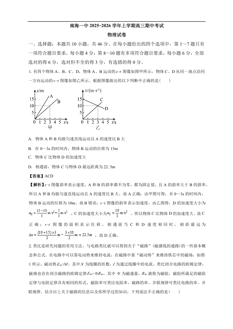 高三物理答案--广州市南海中学2025-2026学年高三上学期10月期中考试