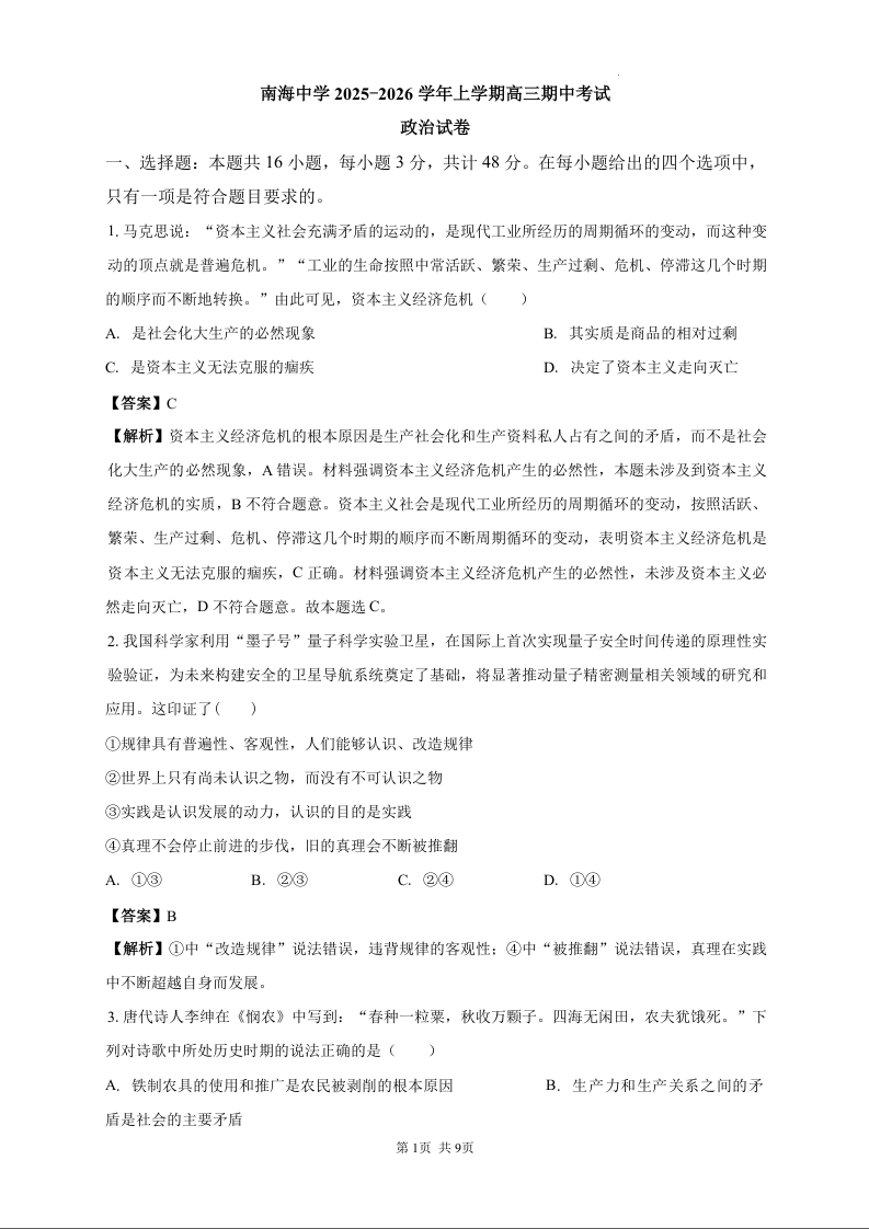 高三政治答案--广州市南海中学2025-2026学年高三上学期10月期中考试